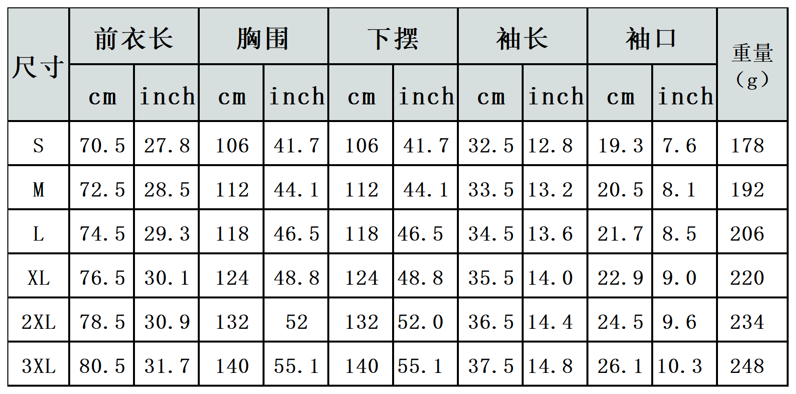 【特别说明】此尺码数据在衣服平铺下测量所得,因测量方法不同,误差在1-3cm内的属于正常现象。