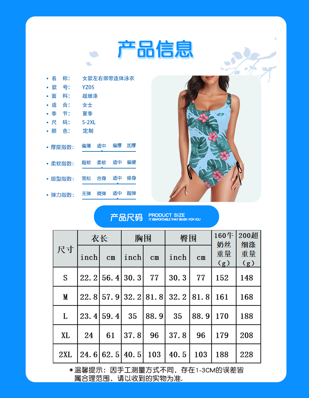 中文名称:女款左右绑带连体泳衣英文名称: Women's adult one-piece swimsuit产品编号:YZ05生产工艺: 满印印花产品材质: 超细涤/牛奶丝