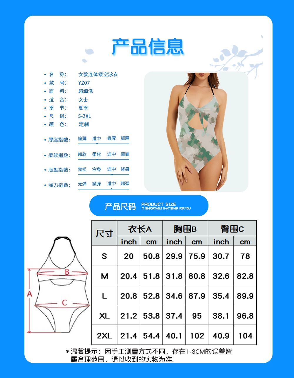 中文名称:女款连体镂空泳衣英文名称: Women's adult one-piece swimsuit产品编号:YZ07LW生产工艺: 满印印花产品材质: 超细涤/牛奶丝