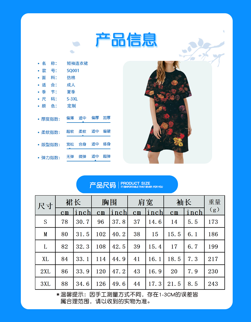中文名称:短袖连衣裙英文名称:产品货号:SQ001生产工艺: 满印印花产品材质: 仿棉