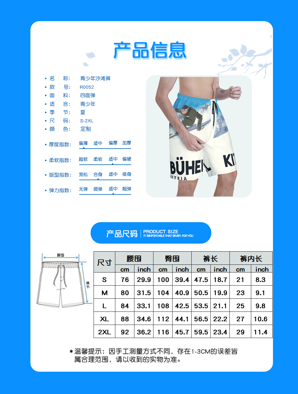 【产品性能】柔软轻巧速干,亲肤,穿着宽松,非常舒适。弹力腰围,穿脱方便,适合身材范围更广。