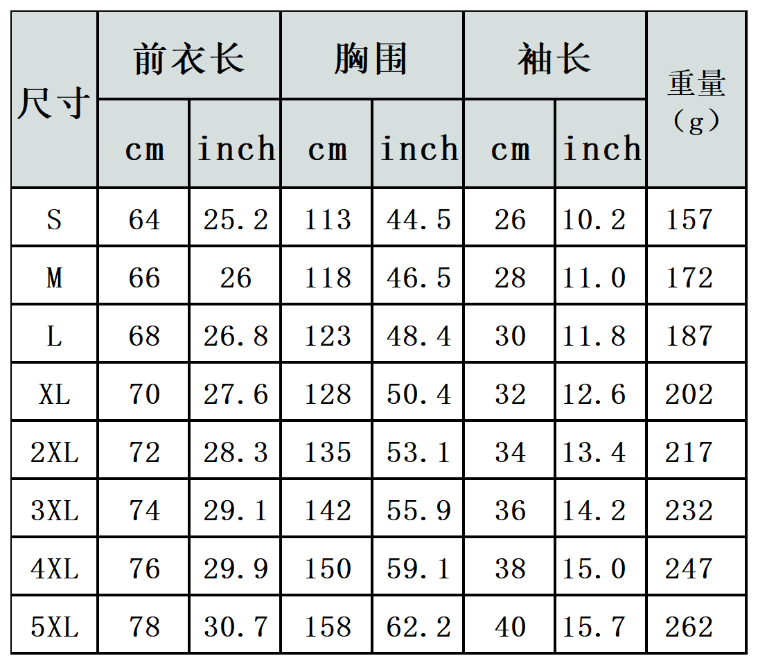 【特别说明】此尺码数据在衣服平铺下测量所得,因测量方法不同,误差在1-3cm内的属于正常现象。