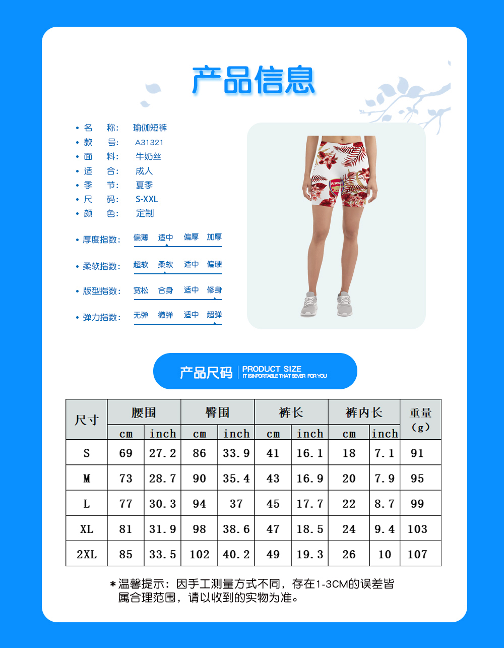 中文名称: 3D 瑜珈短裤英文名称: Yoga pants产品编号:A31321生产工艺: 满印印花产品材质: 涤纶(Polyester)