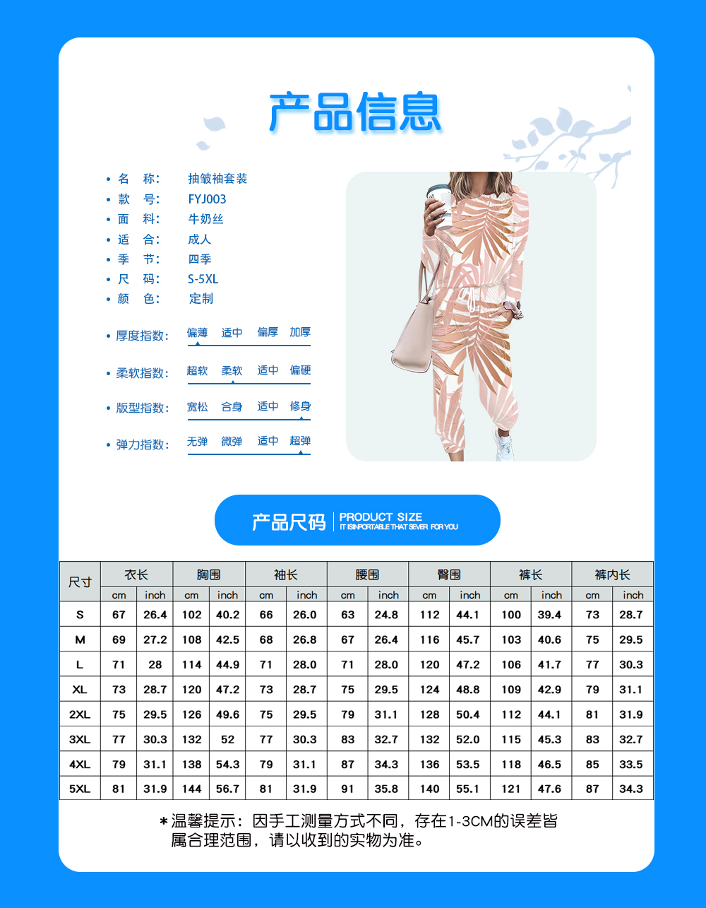 中文名称:抽皱袖套装 英文名称:产品货号:FYJ003生产工艺: 满印印花产品材质:牛奶丝