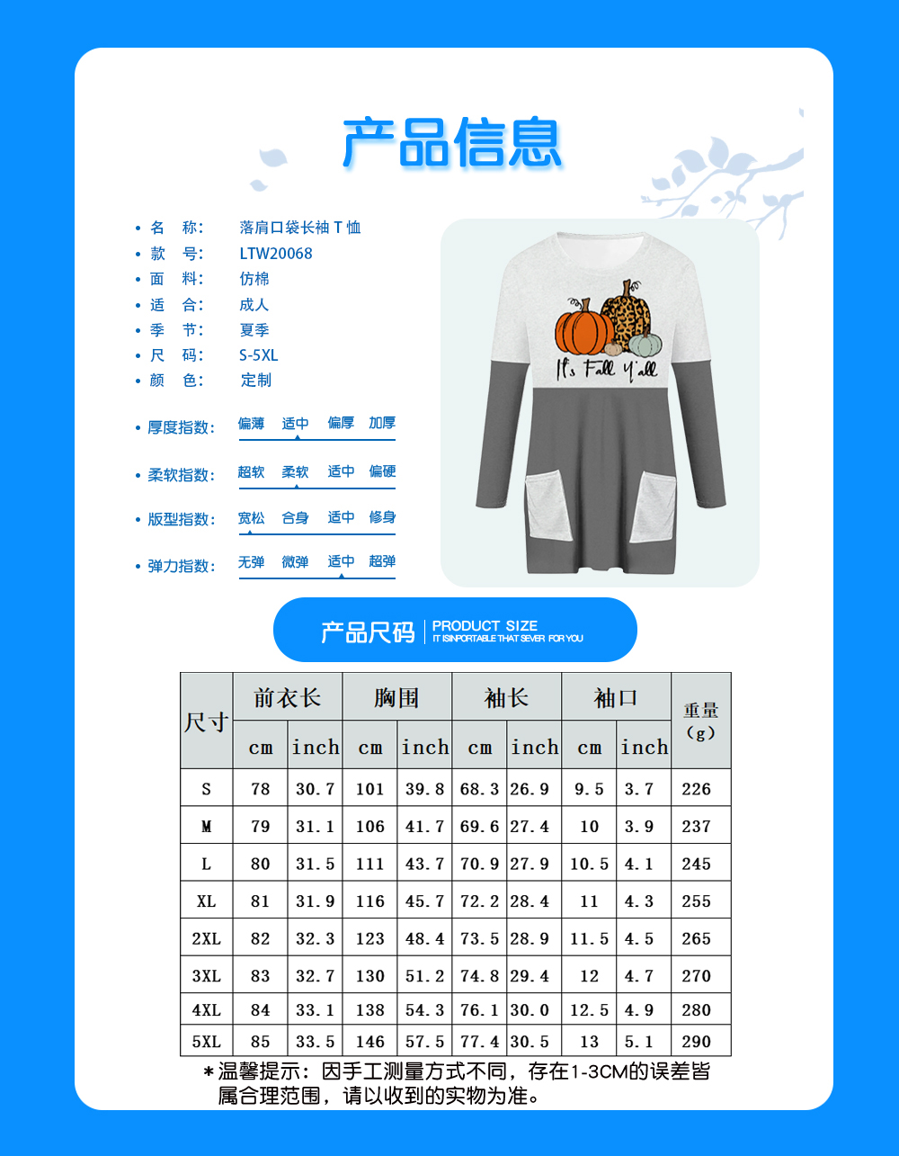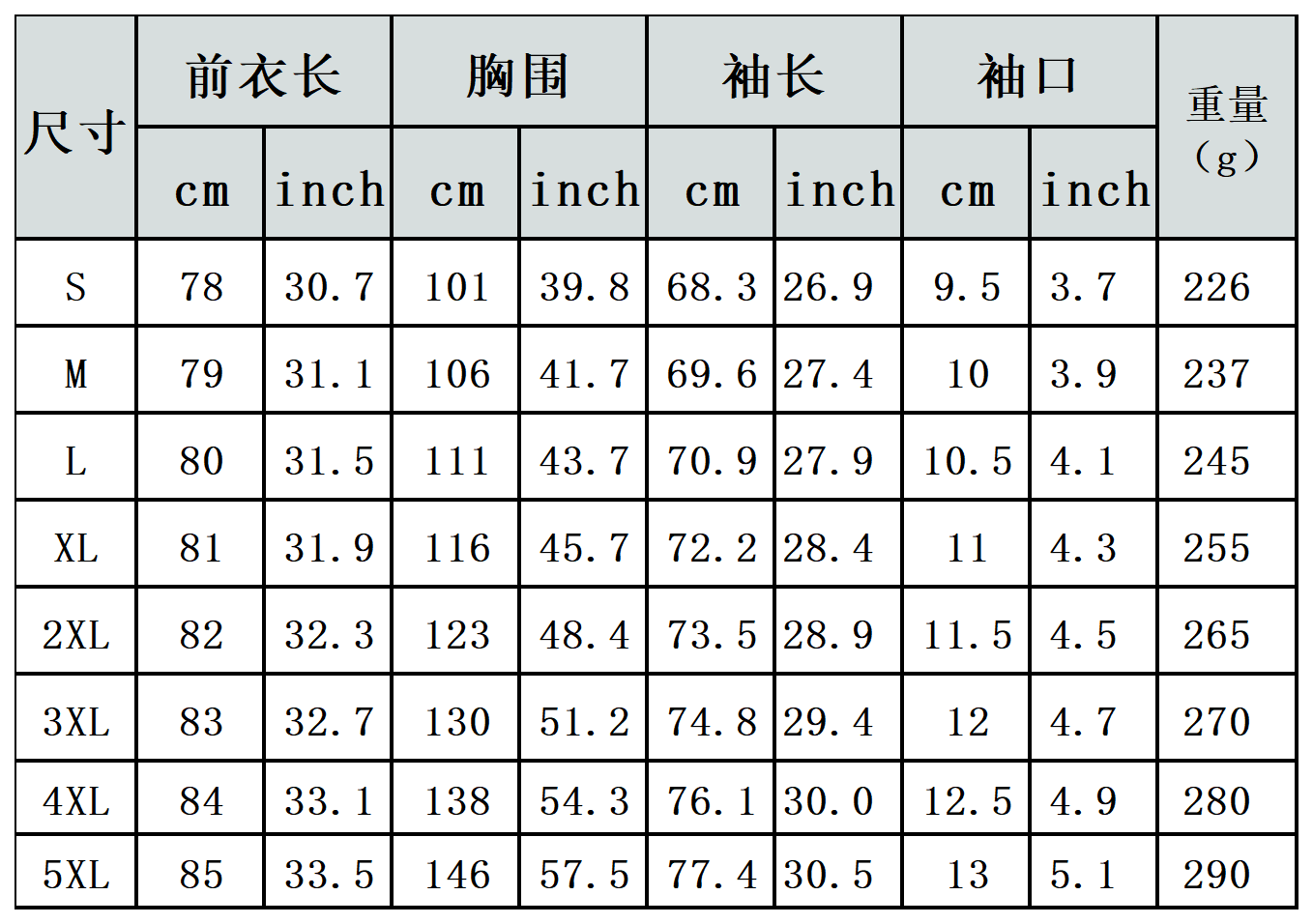 【特别说明】此尺码数据在衣服平铺下测量所得,因测量方法不同,误差在1-3cm内的属于正常现象