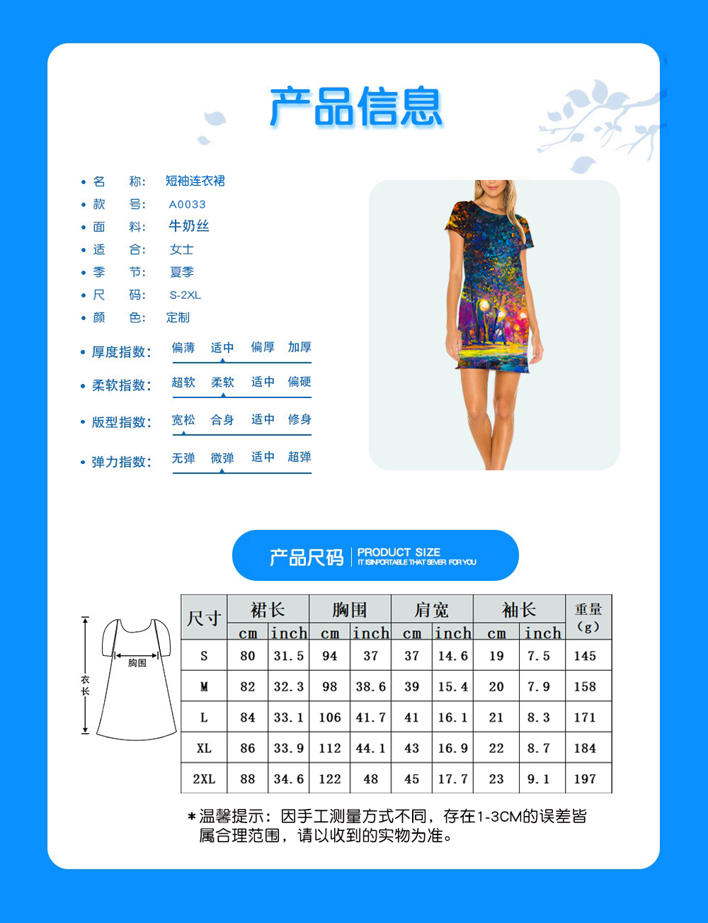 中文名称:短袖裙子英文名称:产品编号:A0033产工艺: 满印印花产品材质: 牛奶丝