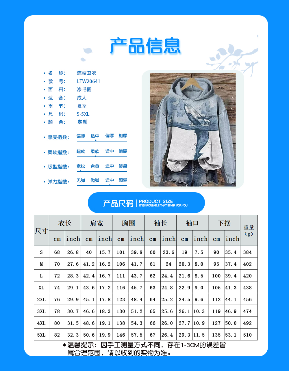 【特别说明】此尺码数据在衣服平铺下测量所得,因测量方法不同,误差在1-3cm内的属于正常现象。