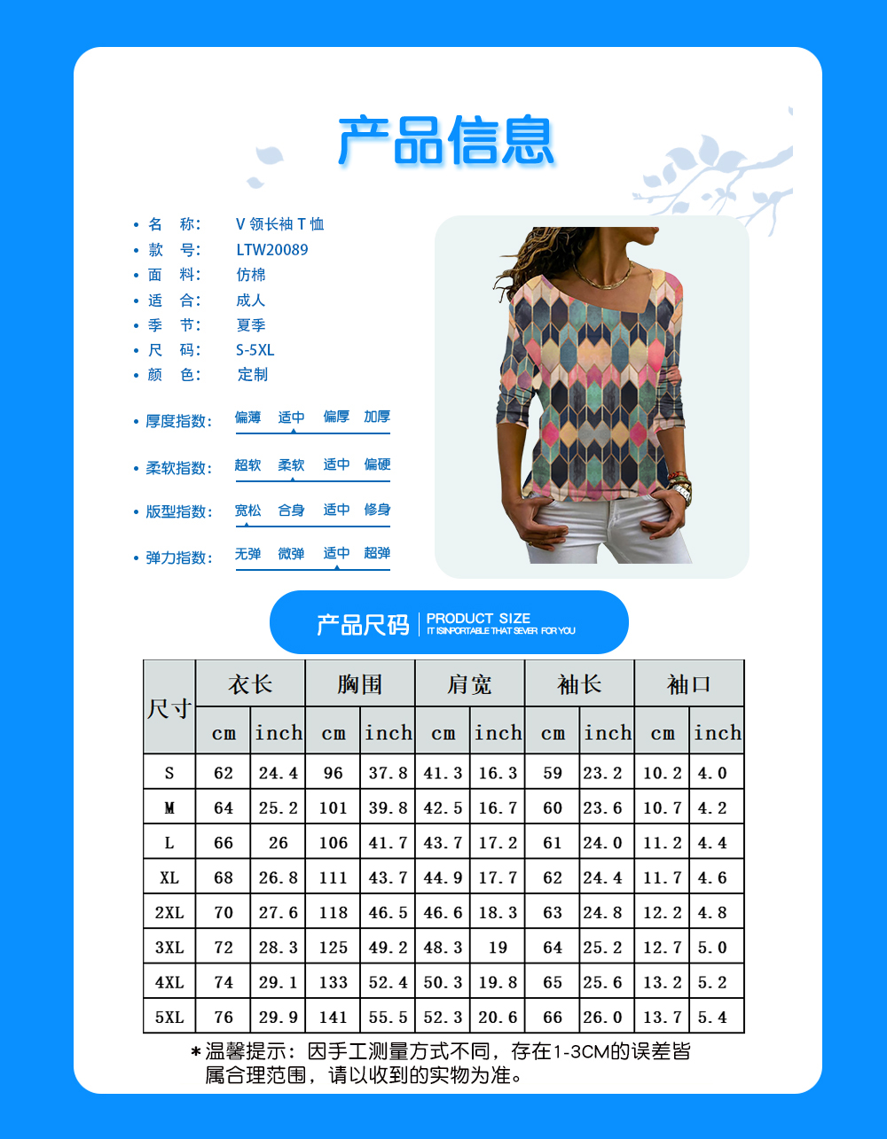 中文名称:歪V领长袖T恤 英文名称:产品货号:LTW20089生产工艺: 满印印花产品材质: 涤纶(Polyester)