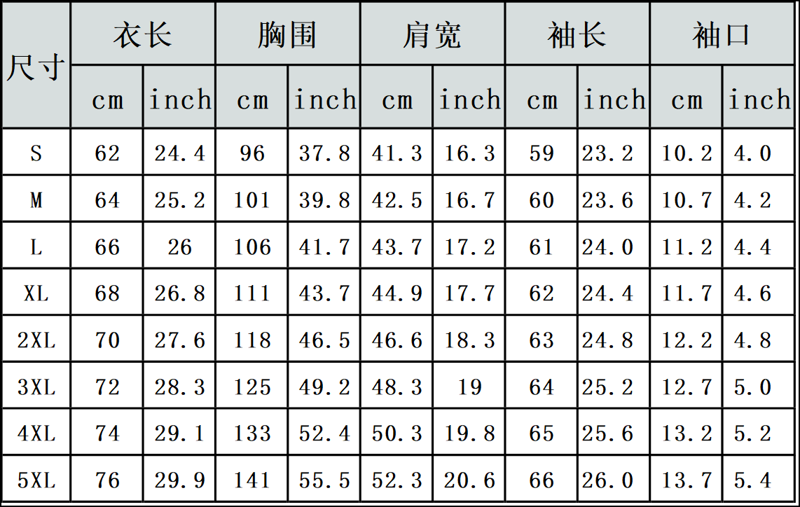 【特别说明】此尺码数据在衣服平铺下测量所得,因测量方法不同,误差在1-3cm内的属于正常现象