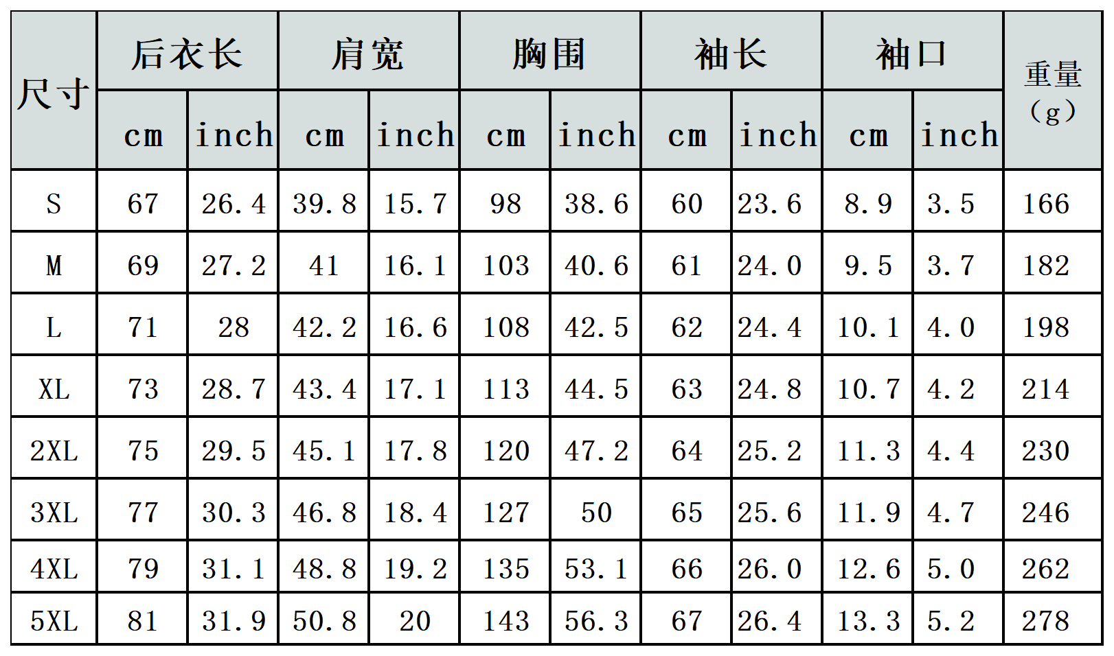 【特别说明】此尺码数据在衣服平铺下测量所得,因测量方法不同,误差在1-3cm内的属于正常现象