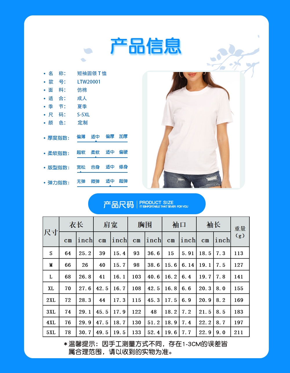 中文名称:短袖圆领T恤英文名称:产品货号:LTW20001生产工艺: 满印印花产品材质: 涤纶(Polyester)