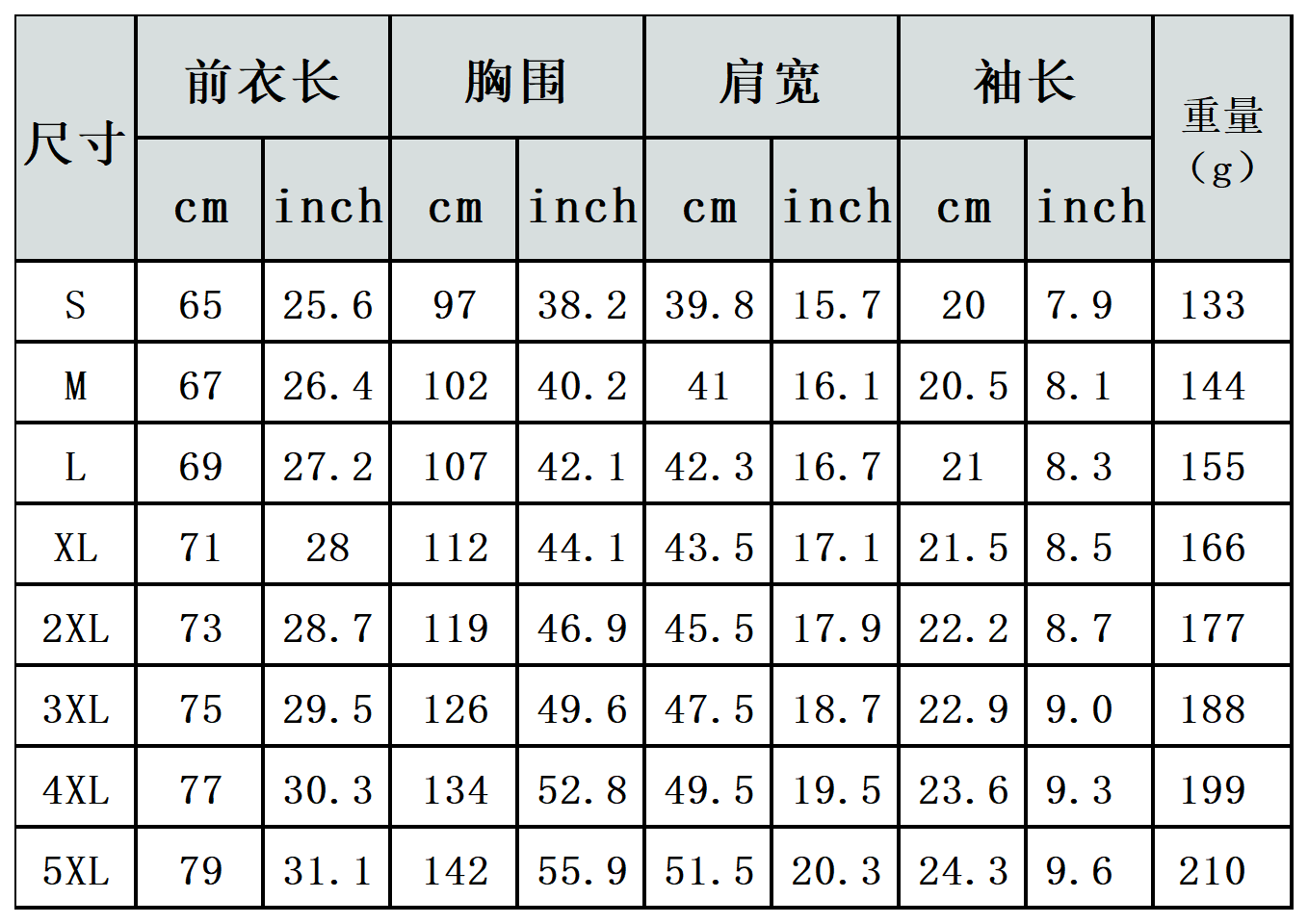 【特别说明】此尺码数据在衣服平铺下测量所得,因测量方法不同,误差在1-3cm内的属于正常现象。