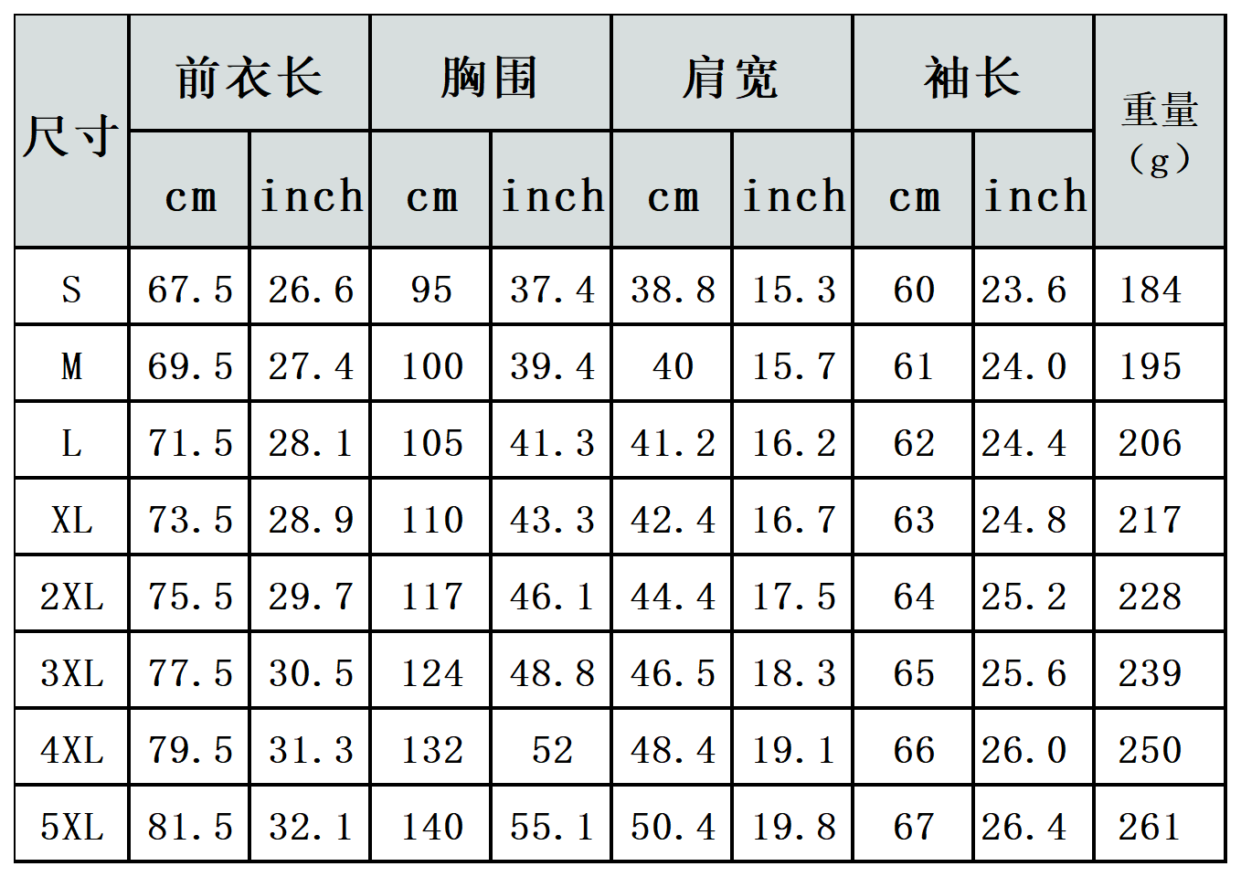 【特别说明】此尺码数据在衣服平铺下测量所得,因测量方法不同,误差在1-3cm内的属于正常现象。
