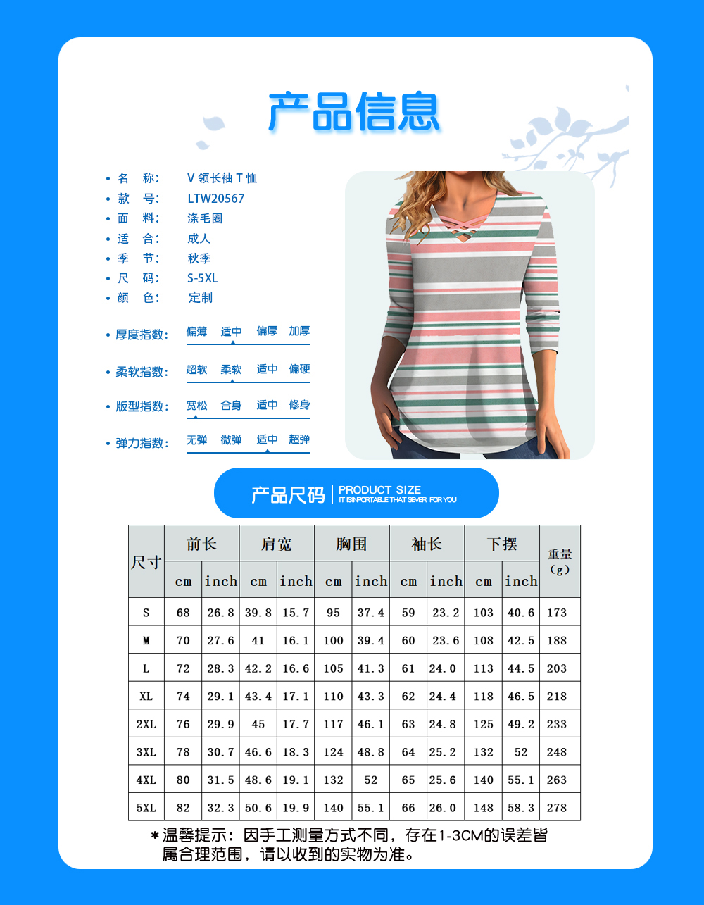 中文名称: V领长袖上衣英文名称:产品编号:LTW20567产工艺: 满印印花产品材质: 仿棉