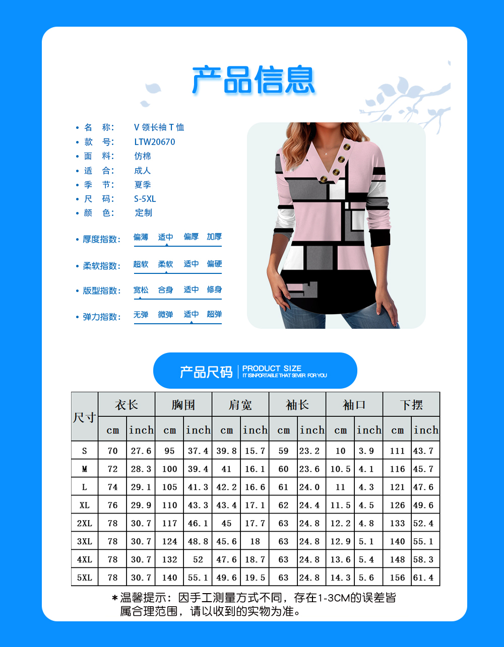 中文名称:V领长袖T恤文名称:产品货号:LTW20670生产工艺: 满印印花产品材质: 仿棉