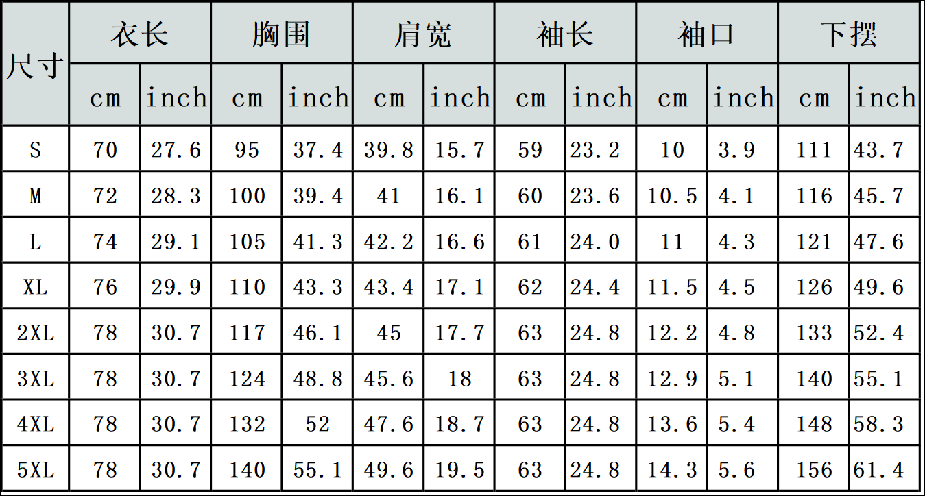 【特别说明】此尺码数据在衣服平铺下测量所得,因测量方法不同,误差在1-3cm内的属于正常现象