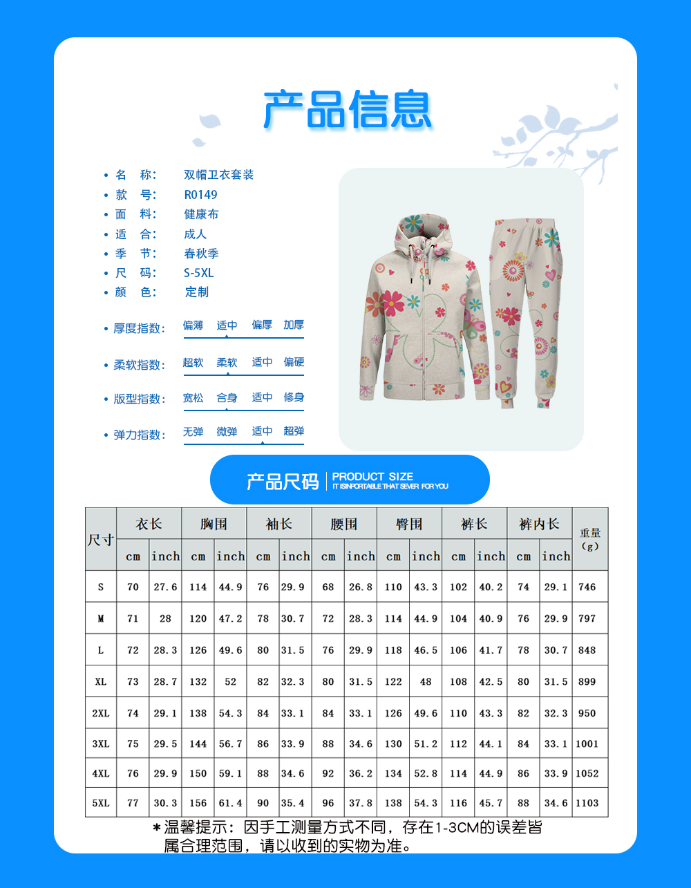 中文名称:双帽拉链卫衣套装英文名称:产品货号:R0149生产工艺: 满印印花产品材质: 健康布