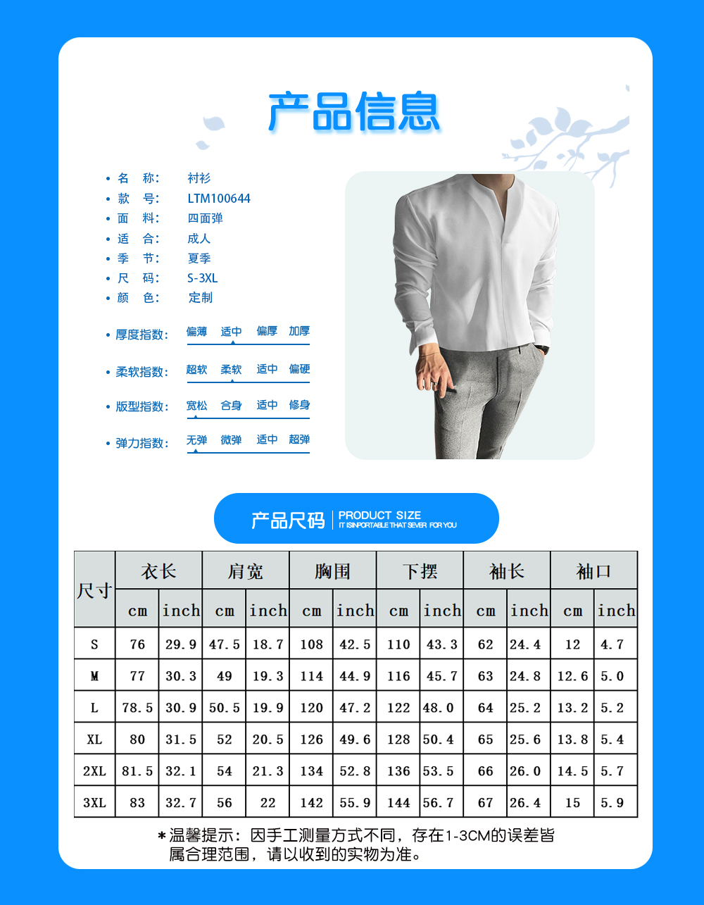 文名称:暗门襟无领长袖衬衫英文名称:产品货号:LTM100644生产工艺: 满印印花产品材质:四面弹