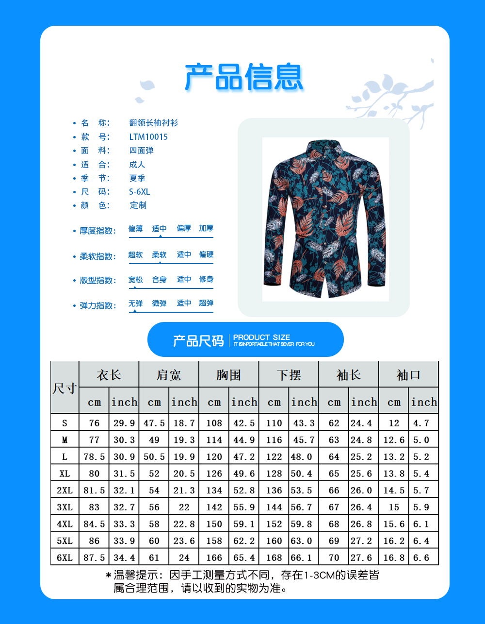 中文名称:翻领长袖衬衫英文名称:产品货号:LTM10015生产工艺: 满印印花产品材质: 涤纶(Polyester)