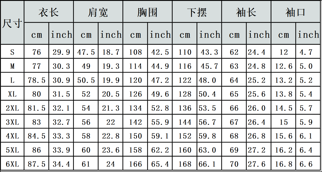 【特别说明】此尺码数据在衣服平铺下测量所得,因测量方法不同,误差在1-3cm内的属于正常现象
