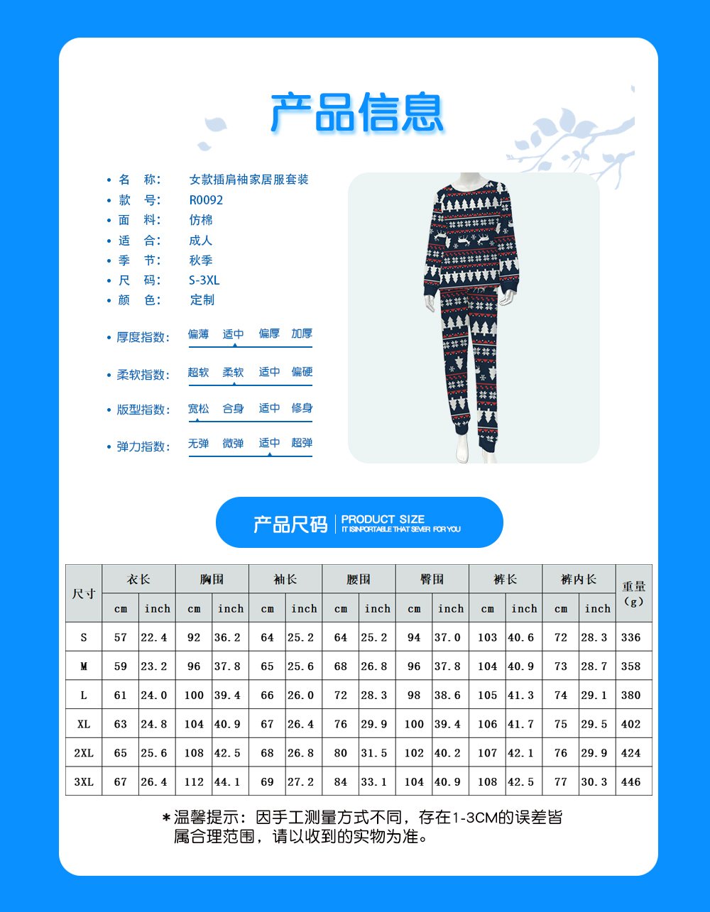 中文名称:女款插肩袖家居服套装英文名称:产品货号:R0092生产工艺: 满印印花产品材质: 仿棉