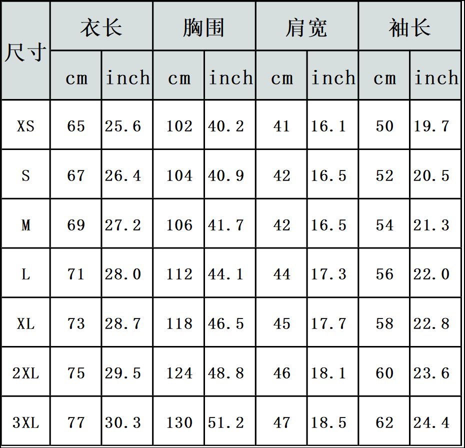 【特别说明】此尺码数据在衣服平铺下测量所得,因测量方法不同,误差在1-3cm内的属于正常现象