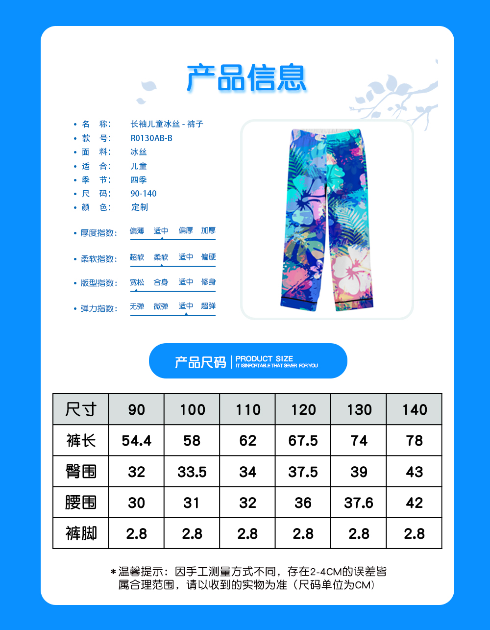 中文名称:长袖儿童冰丝套装-裤子英文名称: Ice silk suit产品货号:R0130AB-B生产工艺: 满印印花产品材质: 涤纶(Polyester)