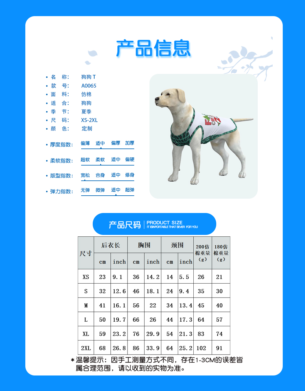 中文名称:狗狗服英文名称:产品货号:A0065生产工艺: 满印印花产品材质:仿棉