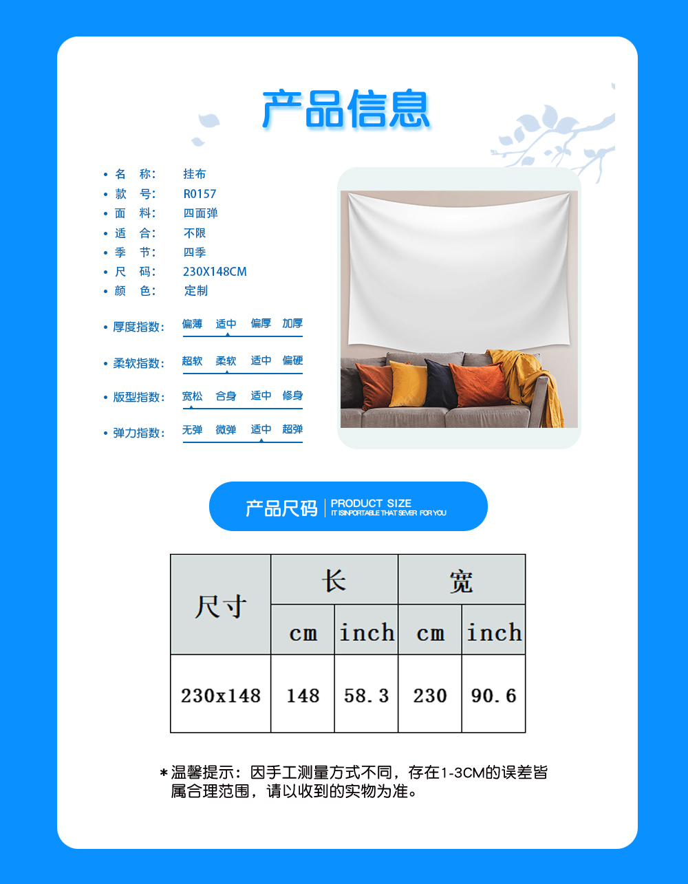 中文名称:230x148CM挂布英文名称:产品货号:R0157生产工艺: 满印印花产品材质:四面弹