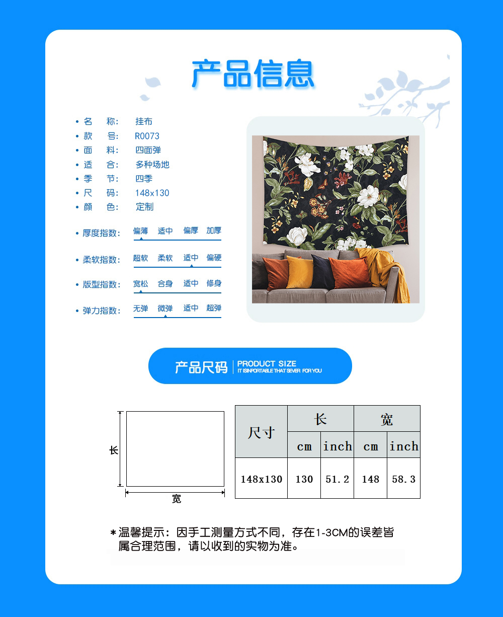 中文名称: 3D 挂布横版148x130cm英文名称: tapestry产品编号:R0073生产工艺: 满印印花产品材质:四面弹