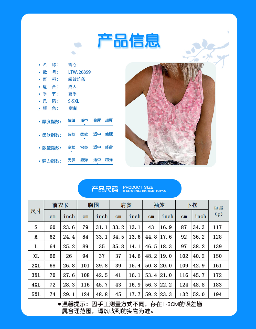 中文名称:背心英文名称:产品货号:LTWJ20859生产工艺: 满印印花产品材质: 螺纹坑条