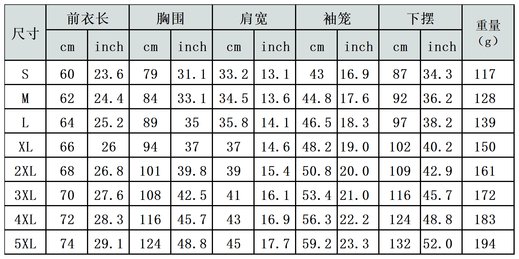 【特别说明】此尺码数据在衣服平铺下测量所得,因测量方法不同,误差在1-3cm内的属于正常现象。