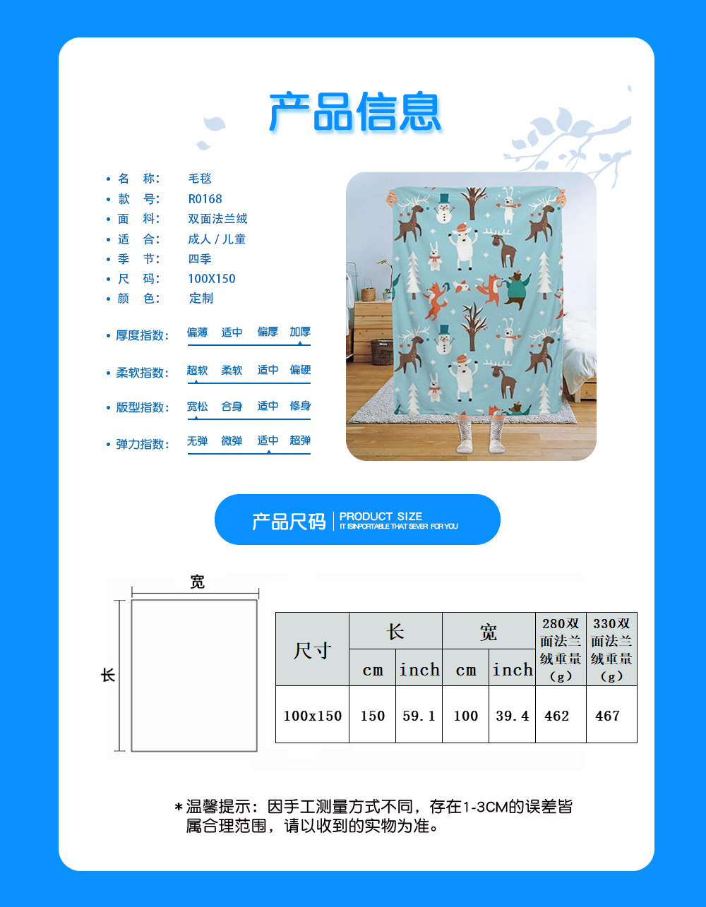 中文名称: 3D 毛毯竖版双面法兰绒100X150cm英文名称: blanket产品编号:R0168生产工艺: 满印印花产品材质:双面法兰绒