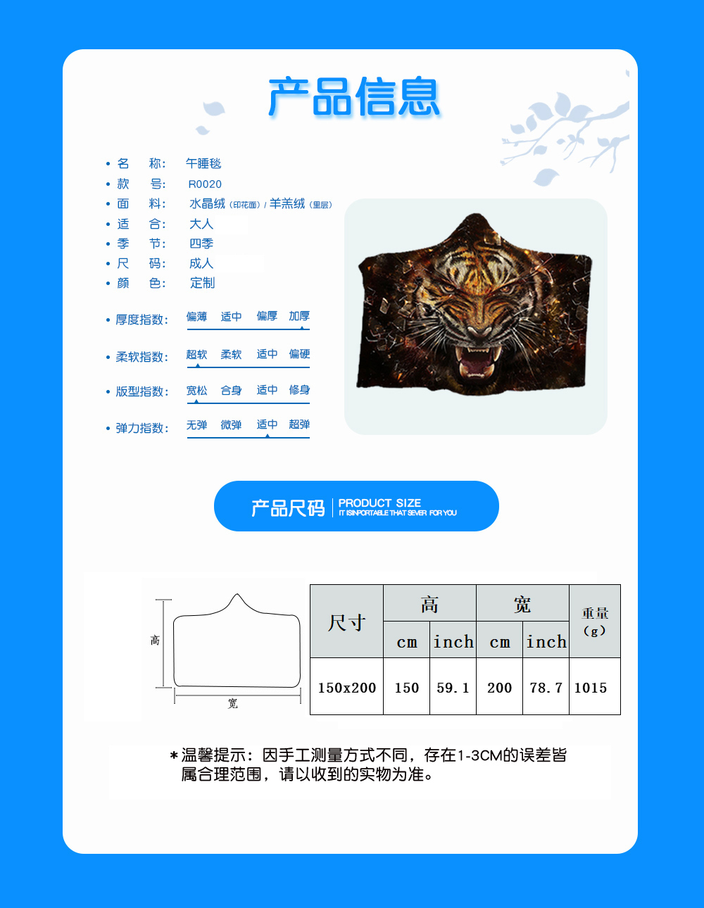 中文名称: 午睡毯水晶绒150x200cm英文名称: A nap blanket产品编号:R0020生产工艺: 满印印花产品材质:水晶绒