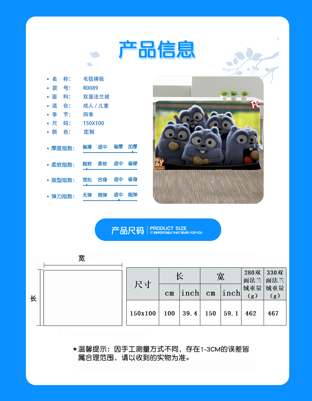 中文名称: 3D 毛毯横版双面法兰绒150X100cm英文名称: blanket产品编号:R0089生产工艺: 满印印花产品材质:双面法兰绒