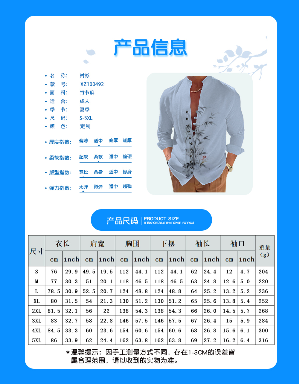 中文名称:男竹节麻门襟扣袢立领长袖衬衫英文名称:产品货号:XZ100492生产工艺: 满印印花产品材质:竹节麻