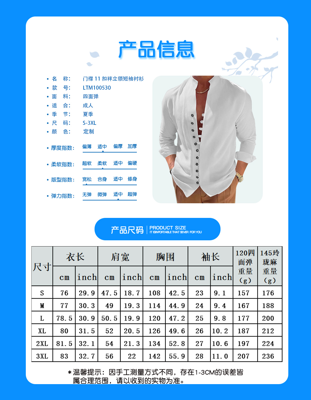 中文名称:11扣袢立领短袖衬衫英文名称:产品货号:LTM100530生产工艺: 满印印花产品材质: 财富816