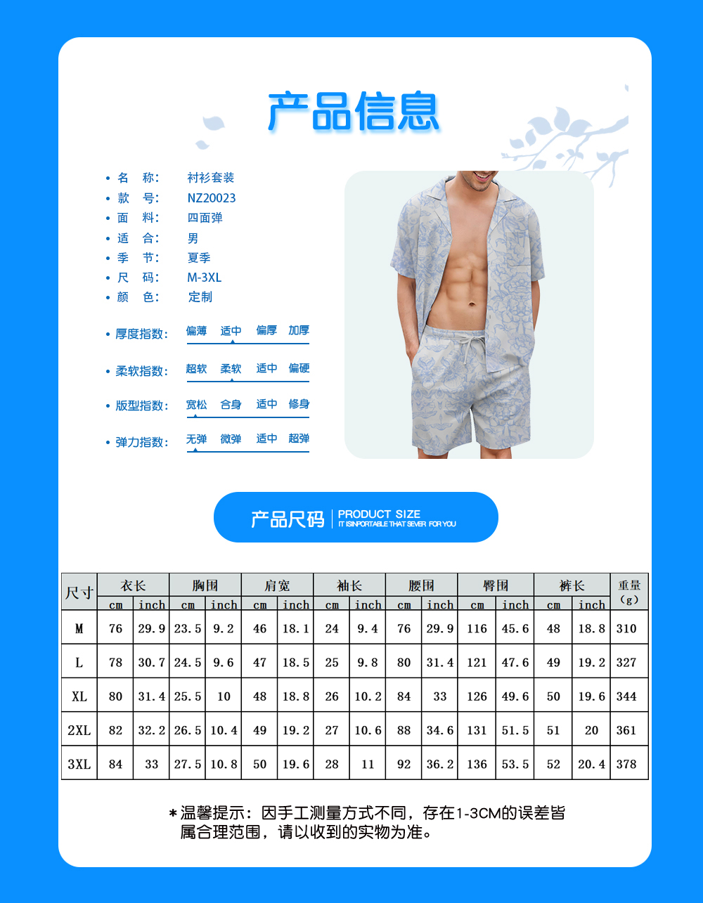 中文名称:短袖衬衫套装英文名称:产品货号:NZ20023生产工艺: 满印印花产品材质: 四面弹