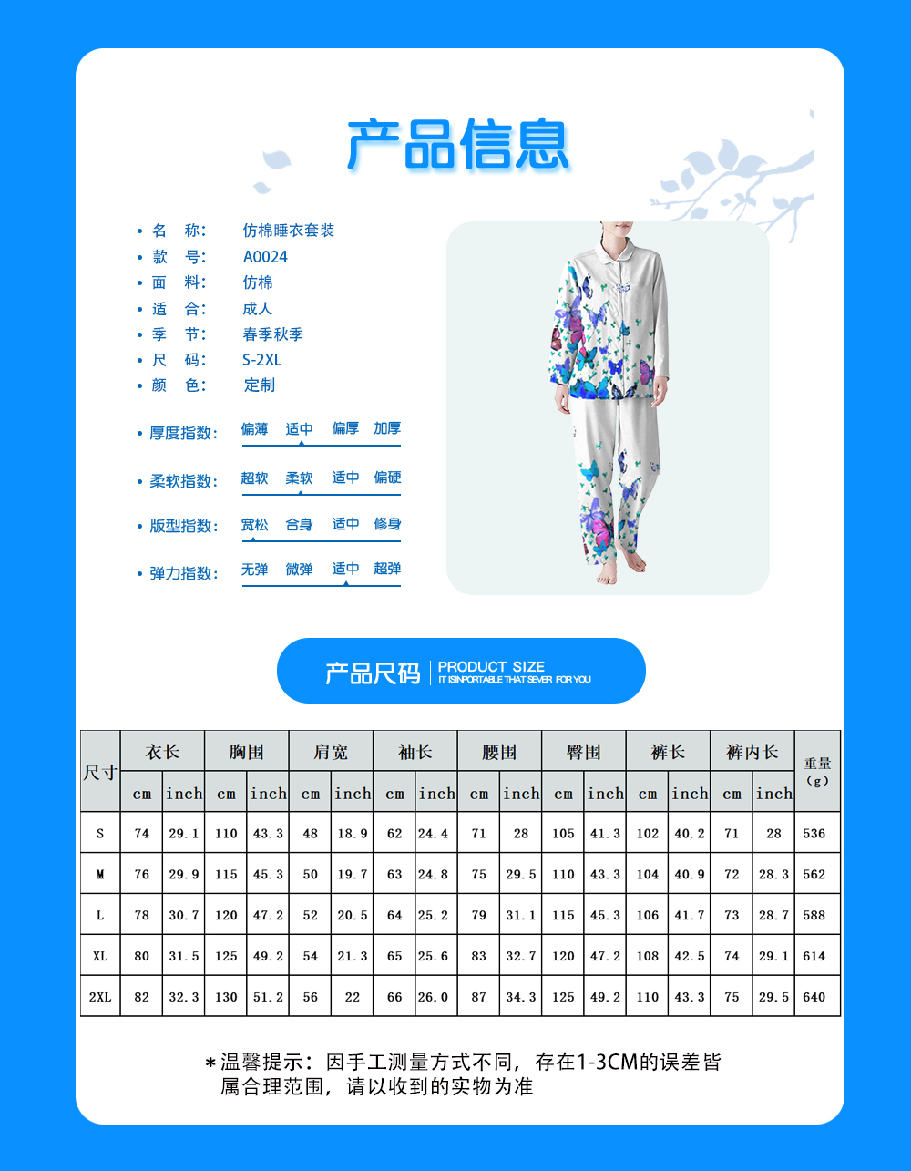 中文名称:仿棉睡衣套装英文名称:产品货号:A0024生产工艺: 满印印花产品材质: 涤纶(Polyester)