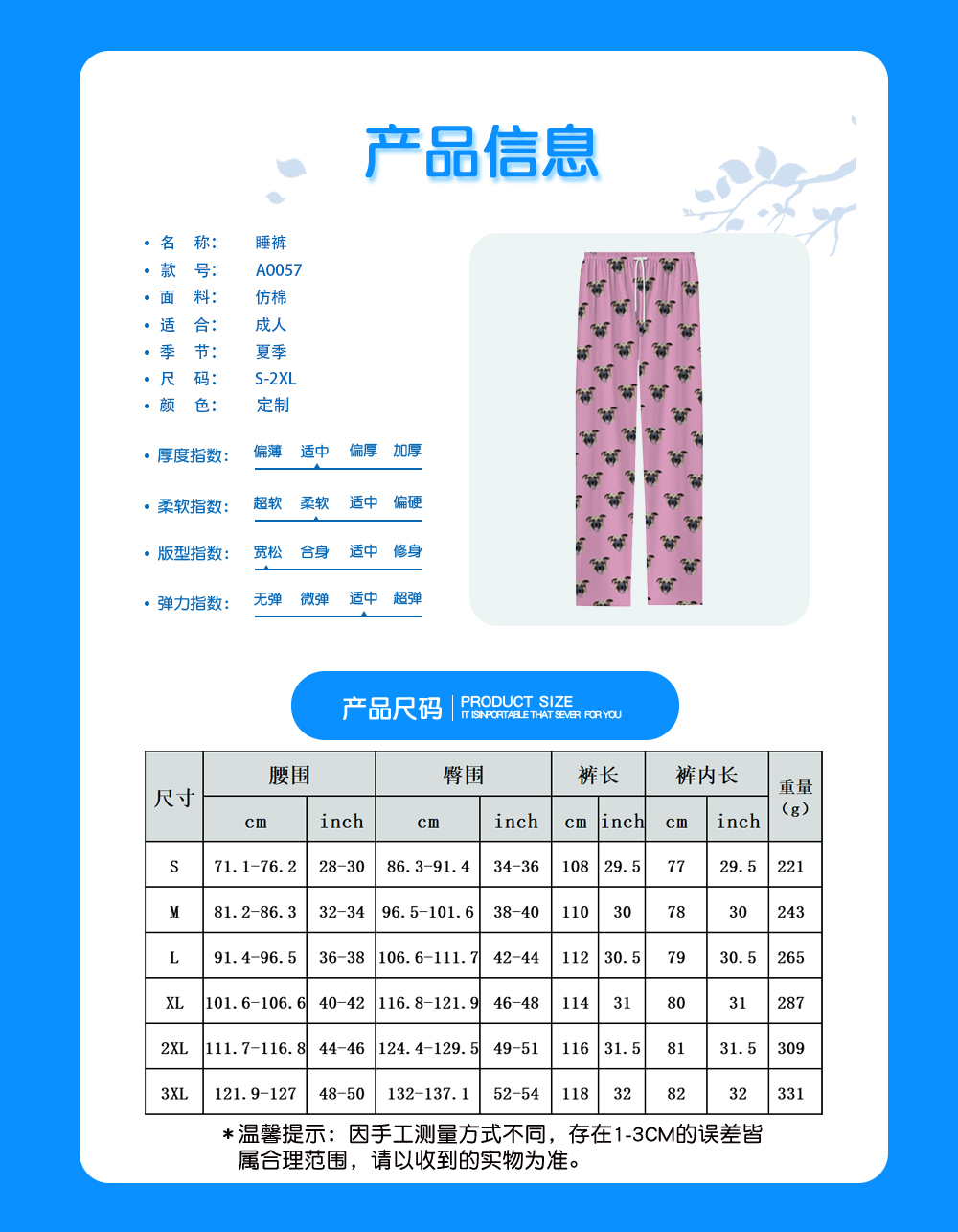 中文名称:睡裤英文名称:产品货号: A0057生产工艺: 满印印花产品材质: 仿棉