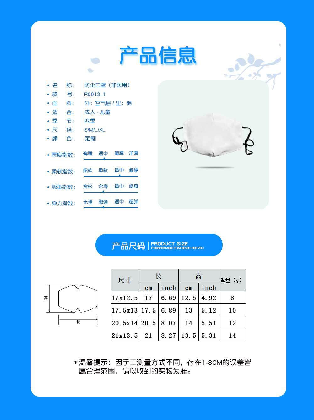 中文名称: 防尘口罩英文名称: Dust mask产品编号: R0013-1生产工艺:满印印花产品材质: 涤纶(Polyester)
