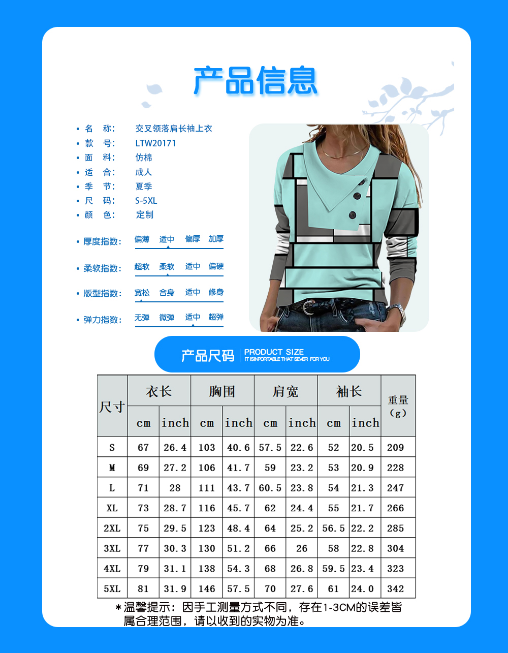 中文名称:交叉领落肩长袖上衣英文名称:产品货号:LTW20171生产工艺: 满印印花产品材质: 仿棉
