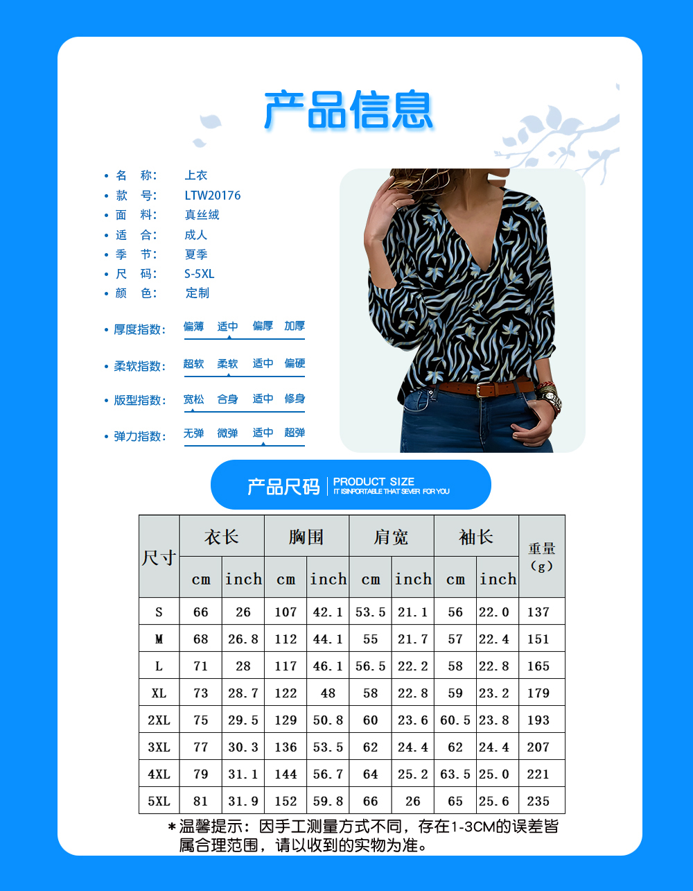 【产品性能】采用真丝绒面料,舒适柔软,轻盈透气。简约v领设计,灵活性更佳。全幅印花,彰显青春个性。