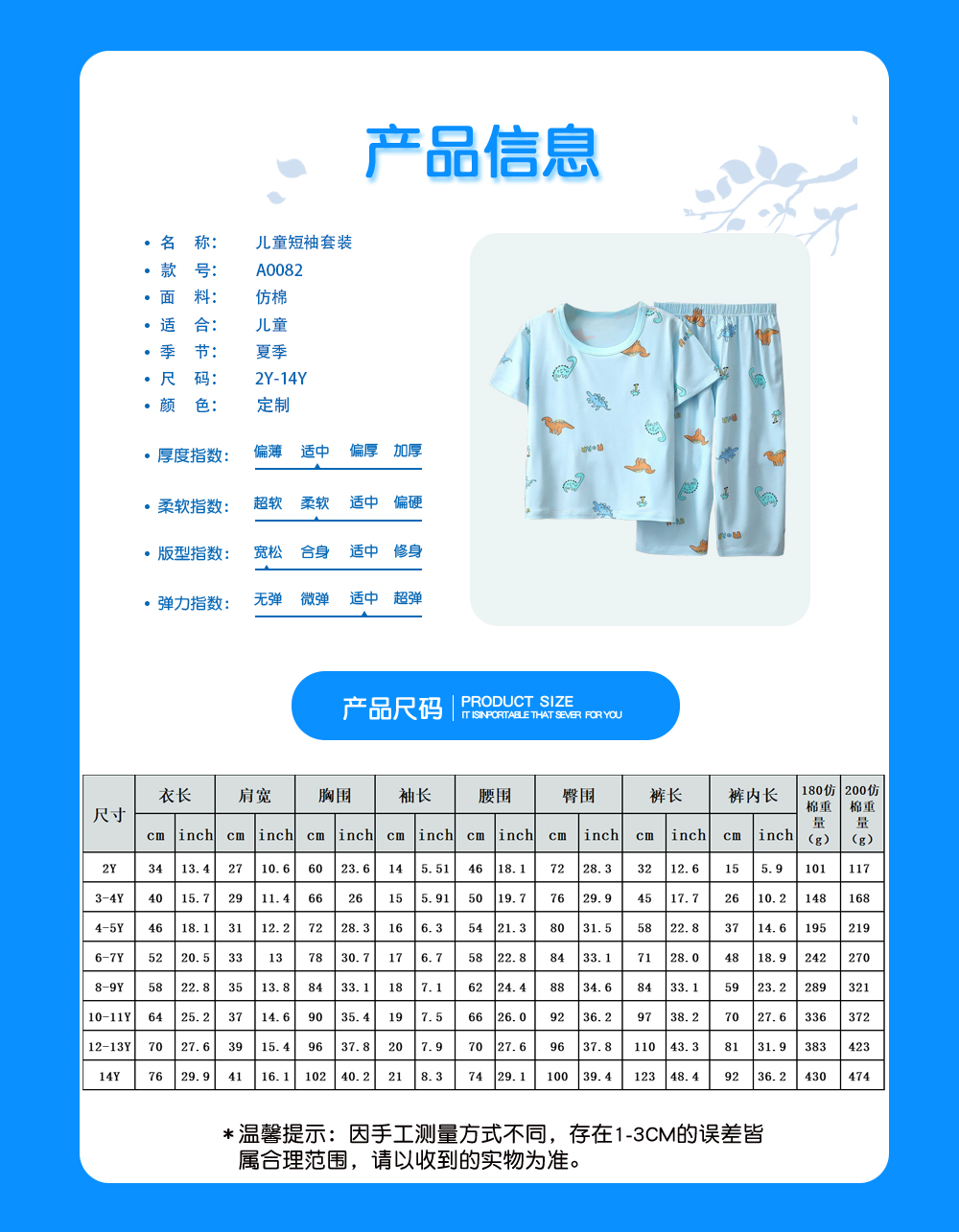 中文名称:儿童短袖套装英文名称:产品货号:A0082生产工艺: 满印印花产品材质: 仿棉