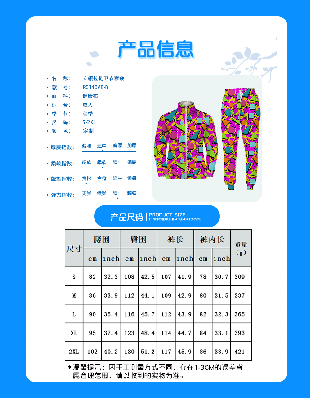 中文名称:立领拉链卫衣套装-裤子英文名称:产品货号:R0140AB-B生产工艺: 满印印花产品材质: 健康布
