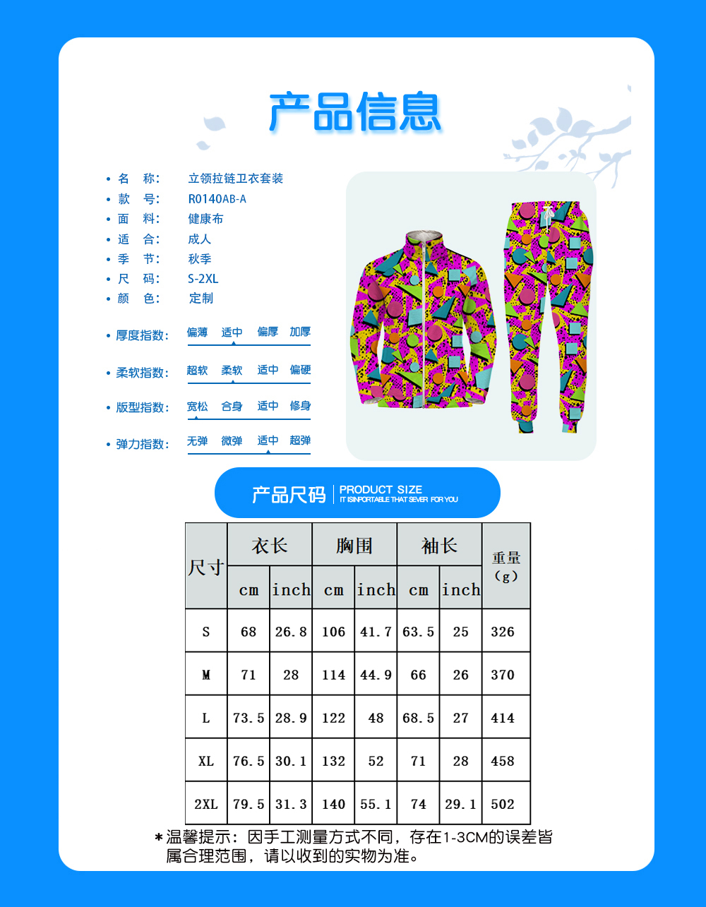 中文名称:立领拉链卫衣套装-衣服英文名称:产品货号:R0140AB-A生产工艺: 满印印花产品材质: 健康布