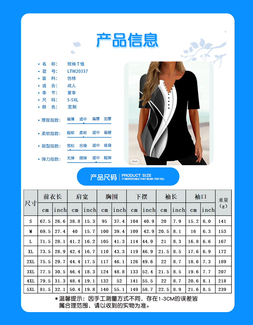 中文名称:短袖英文名称:产品货号:LTW20337生产工艺: 满印印花产品材质: 仿棉