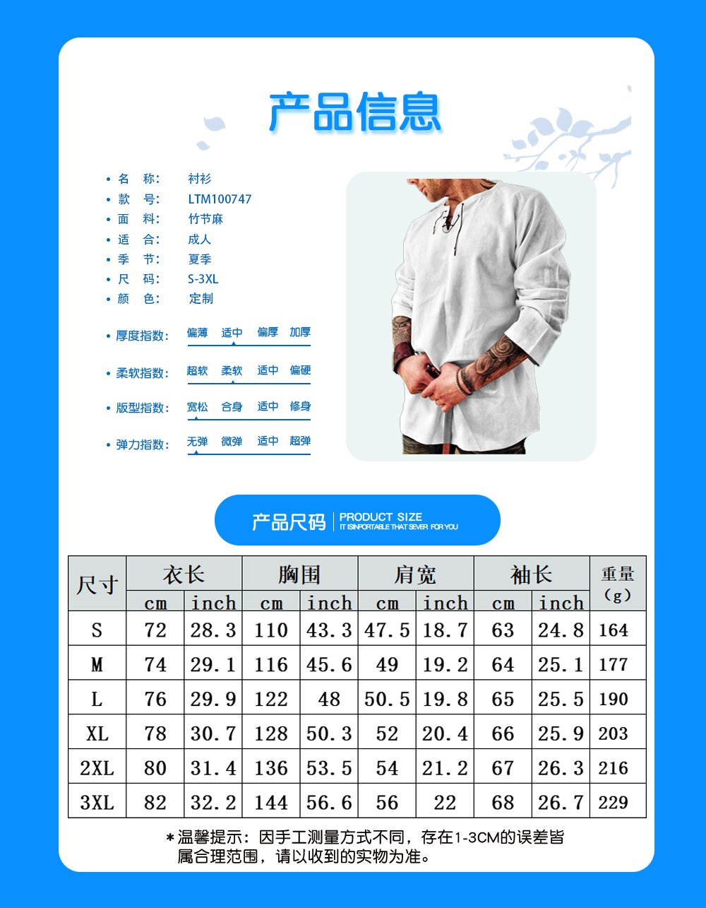 【特别说明】此尺码数据在衣服平铺下测量所得,因测量方法不同,误差在1-3cm内的属于正常现象