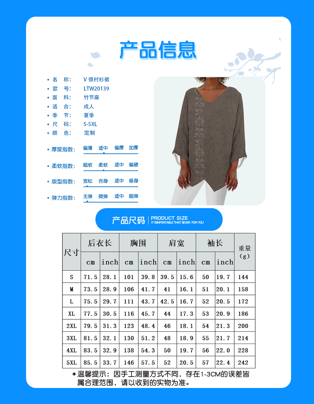 中文名称:女数码印V领不规则下摆衬衫英文名称:产品货号:LTW20139生产工艺: 满印印花产品材质: 竹节麻