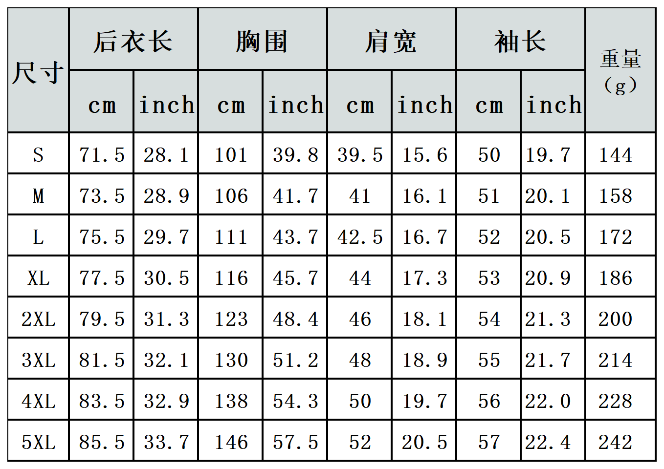 【特别说明】此尺码数据在衣服平铺下测量所得,因测量方法不同,误差在1-3cm内的属于正常现象